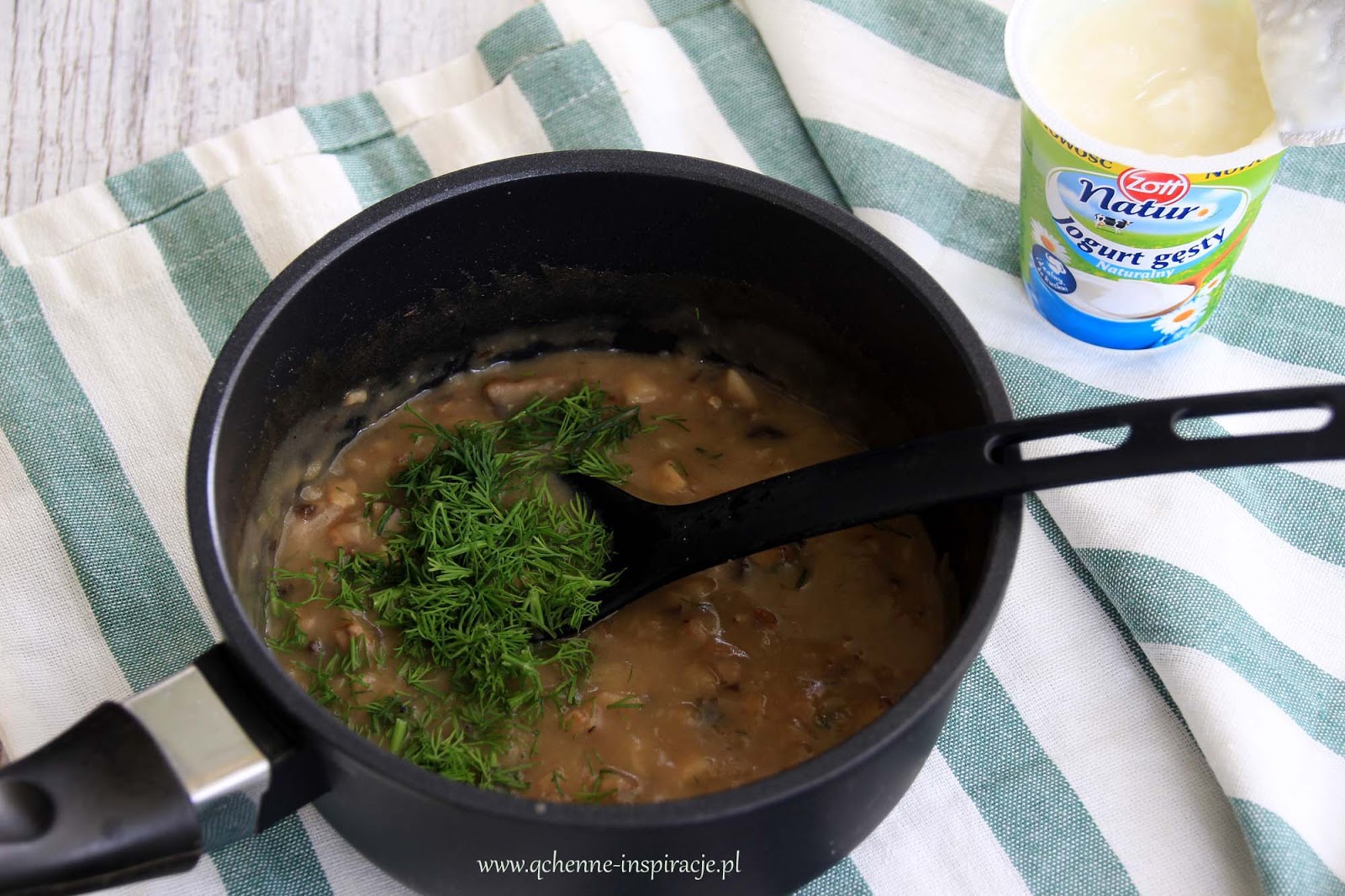 Sosu grzybowego nie zaklepuję śmietaną, a jogurtem naturalnym, dlatego musi być to jogurt gęsty. Nada się także grecki. Gęstość jogurtu we wszelkich sosach, zwłaszcza tych ciepłych jest kluczowa po to, aby ich nie rozwadniać.