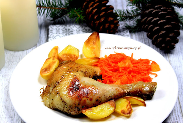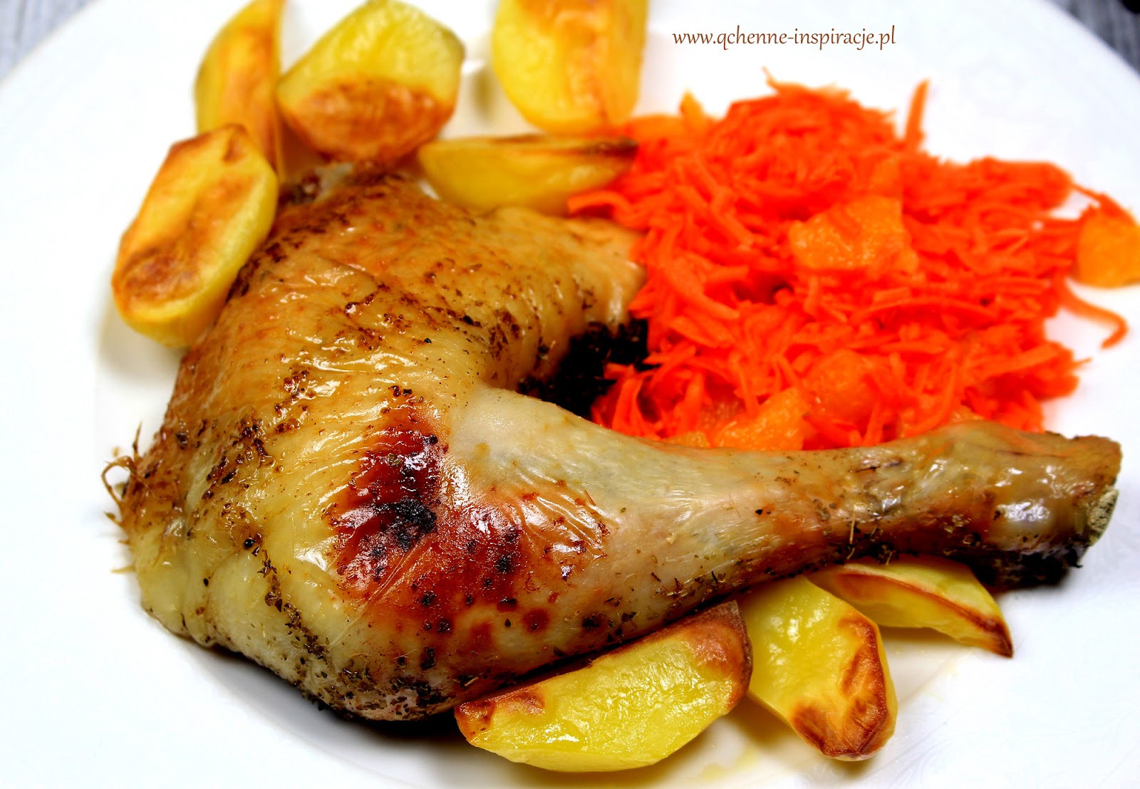 Maślano - piernikowy kurczak wolno pieczony, z jabłkami, pieczonymi ziemniakami i surówką z tartej marchewki z pomarańczą!