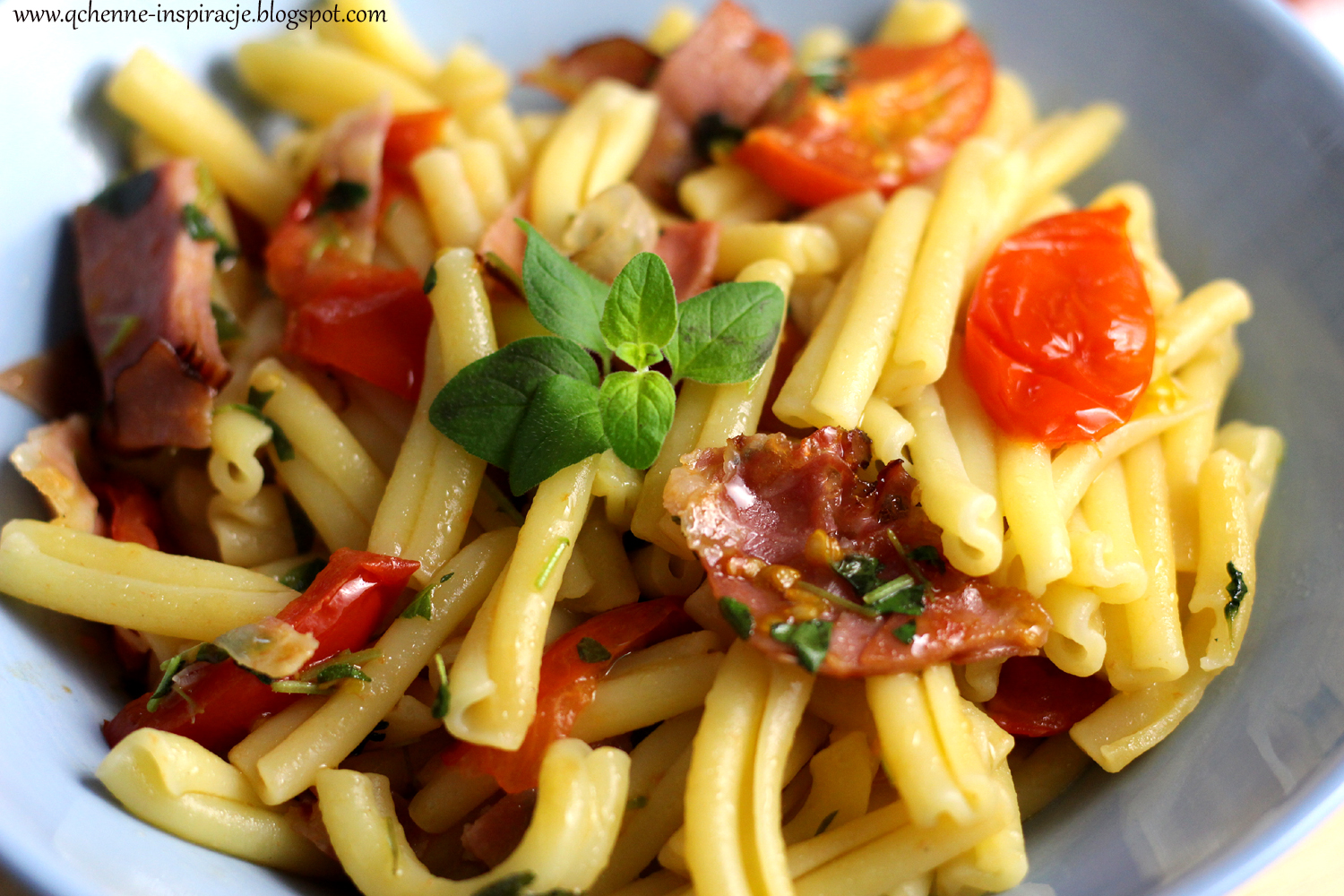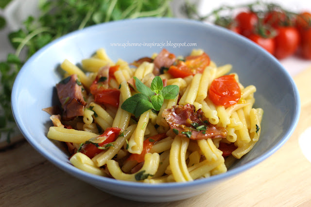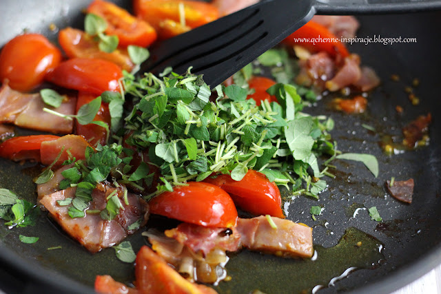 W czasie w którym będzie się gotował makaron, nabierze przyjemnego aromatu. Nie przepadam za wędlinami ale do szynki parmeńskiej i szwarcwaldzkiej mam ogromną słabość. Słona, wędzona, aromatyczna. Genialnie podkreśla smak dań do których jest dodana. Wrzucamy ją na suchą patelnię aby ją lekko przesmażyć. Odda wtedy to co ma najlepsze. Następnie wrzucamy pokrojone w ćwiartki pomidorki koktajlowe.