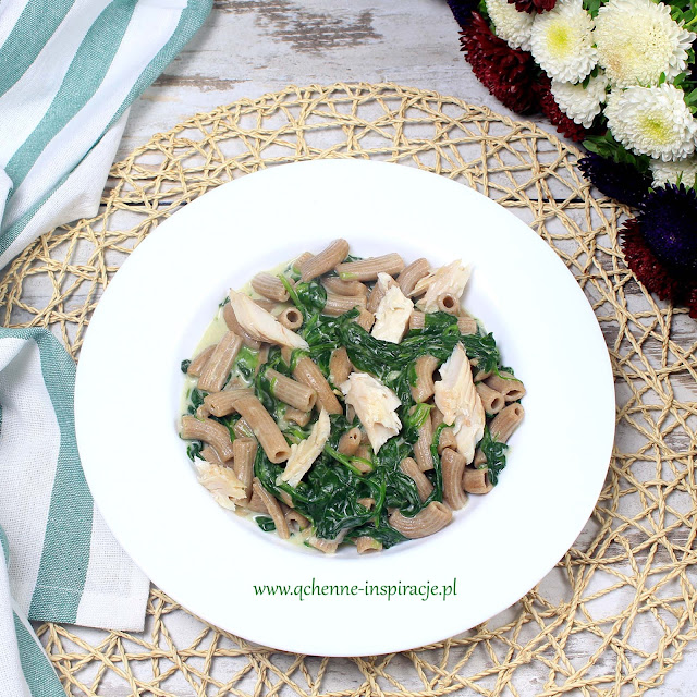 Orkiszowa, pełnoziarnista pasta z wędzoną trocią w sosie ze świeżym szpinakiem. Danie które przygotujecie w 15 minut. Pyszne, sycące, niebanalne. W sam raz na obiad.