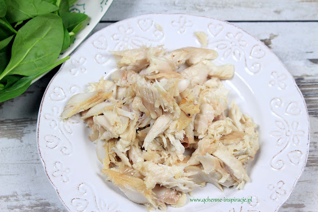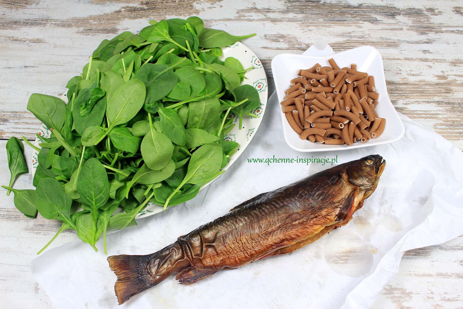 Kolejne rzecz to świeży szpinak. Musi być liściasty. No i ryba, która nie może dominować, więc musi być delikatna. Ja użyłam wędzonej troci. Idealne sprawdzi się też wędzony dorsz. Niestety nie nada się makrela i łosoś ponieważ będą dominować, a tego nie chcemy.