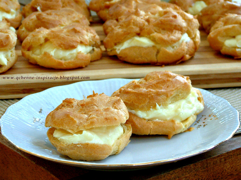 6. Wystudzone ptysie przekrawamy na pół i napełniamy masą budyniową.