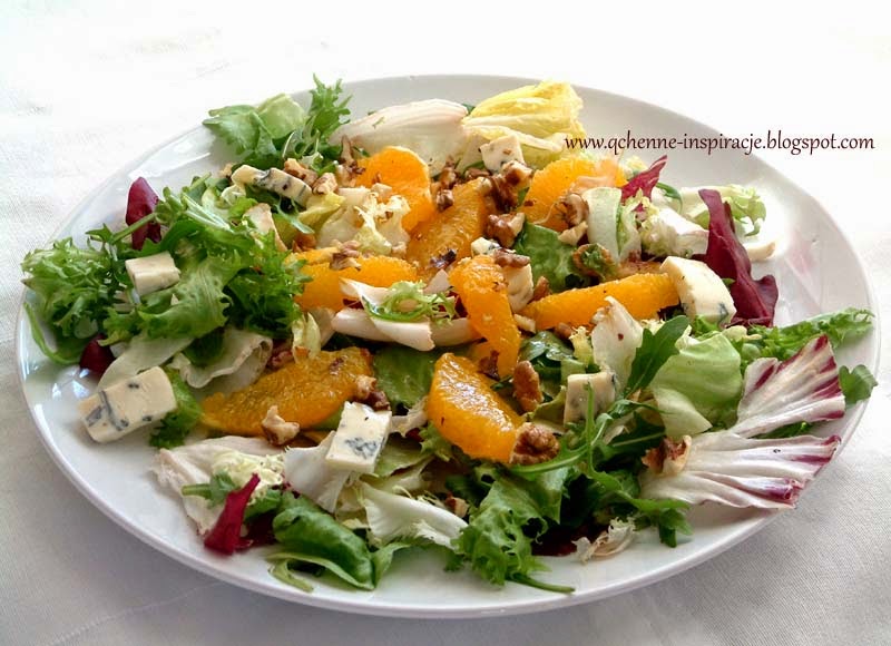 Tak zrodził się pomysł na dzisiejszą sałatkę z wyrazistym w smaku serem blue, orzechami włoskimi (które podczas prażenia na suchej patelni miękną i wydobywają fajny aromat), wyfiletowaną pomarańczą i pomarańczowym dressingiem. Panowie lubią zdecydowane smaki. Zwykły mix sałat z winegretem i jakąś papryką, czy pomidorem dla wielu jest mało atrakcyjny.