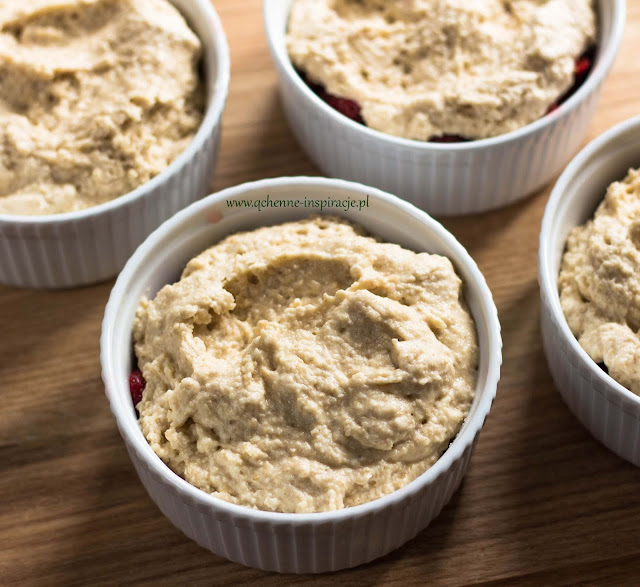 5. Zmielone płatki owsiane mieszamy z proszkiem do pieczenia. Dodajemy do masy jajecznej. Miksujemy minutę. Kładziemy na owocach. Pieczemy 20 minut w temperaturze 180 stopni.