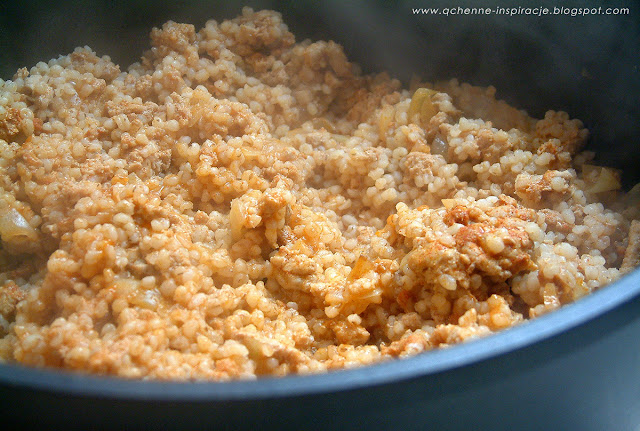 Kaszę zeszkliłam na oleju, dodałam zmielone mięso i przyprawy. Podsmażyłam.Wszystko zalałam wodą i udusiłam do miękkości. Co to dało? Smaki fantastycznie się połączyły tworząc zgraną, wyrazistą i lekko pikantną całość. Kropkę nad i postawiła świeża kolendra i ser z niebieską pleśnią. Przepyszne.