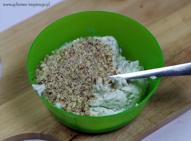 2. Zioła drobniutko siekamy, mieszamy z serkami i migdałami na jednolitą masę.