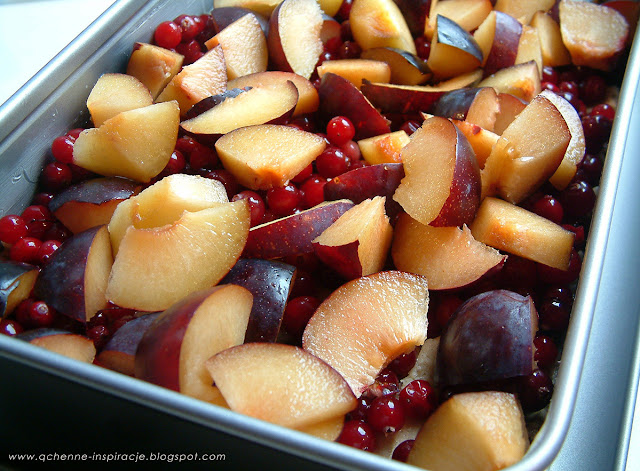 4. Spód i brzegi formy do ciasta smarujemy masłem. 3/4 ciasta wykładamy na spód. Żurawinę mieszamy z 2 łyżkami ksylitolu. Wysypujemy na spód ciasta, przykrywamy pokrojonymi w kawałki śliwkami i kawałkami ciasta. Wierzch można posypać żurawiną.