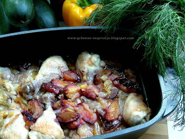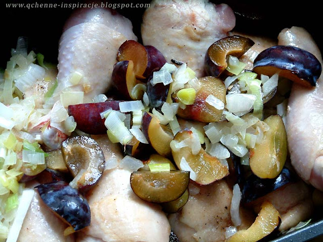 Jeśli robimy większą ilość układamy warstwami: por i cebula, kurczak, śliwki, por i cebula, kurczak, por i cebula śliwki.