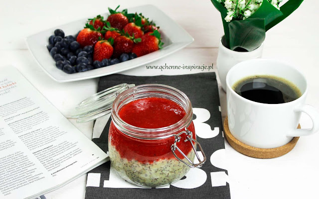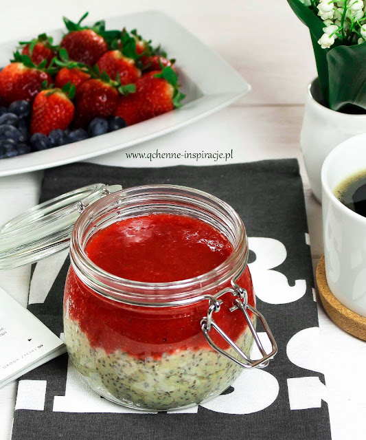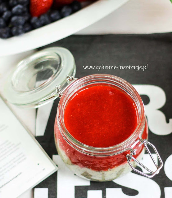 Pudding jaglany. Słodki, waniliowo - kokosowy. Z chia i musem truskawkowym. Przepyszny. Idealny na śniadanie, deser oraz jako przekąska do zabrania do pracy. Ja użyłam mleka kokosowego, ale oczywiście można użyć zwykłego krowiego, lub innego roślinnego. Tak jak lubicie.