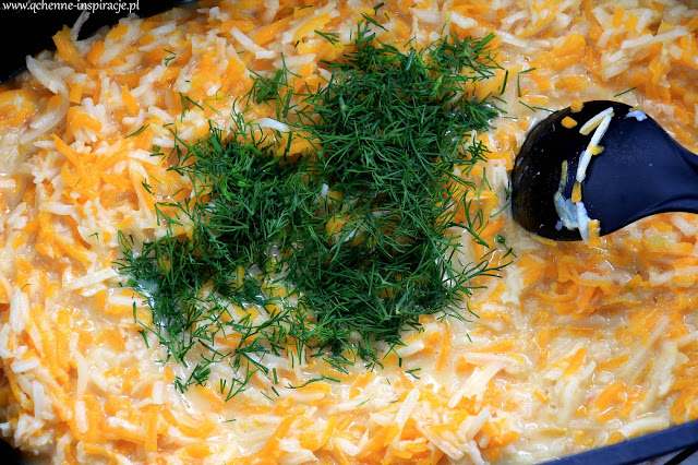 1. Warzywa ścieramy na grubej tarce. Mieszamy z curry. Spód naczynia do zapiekania smarujemy klarowanym masłem. Wrzucamy warzywa. Solimy.