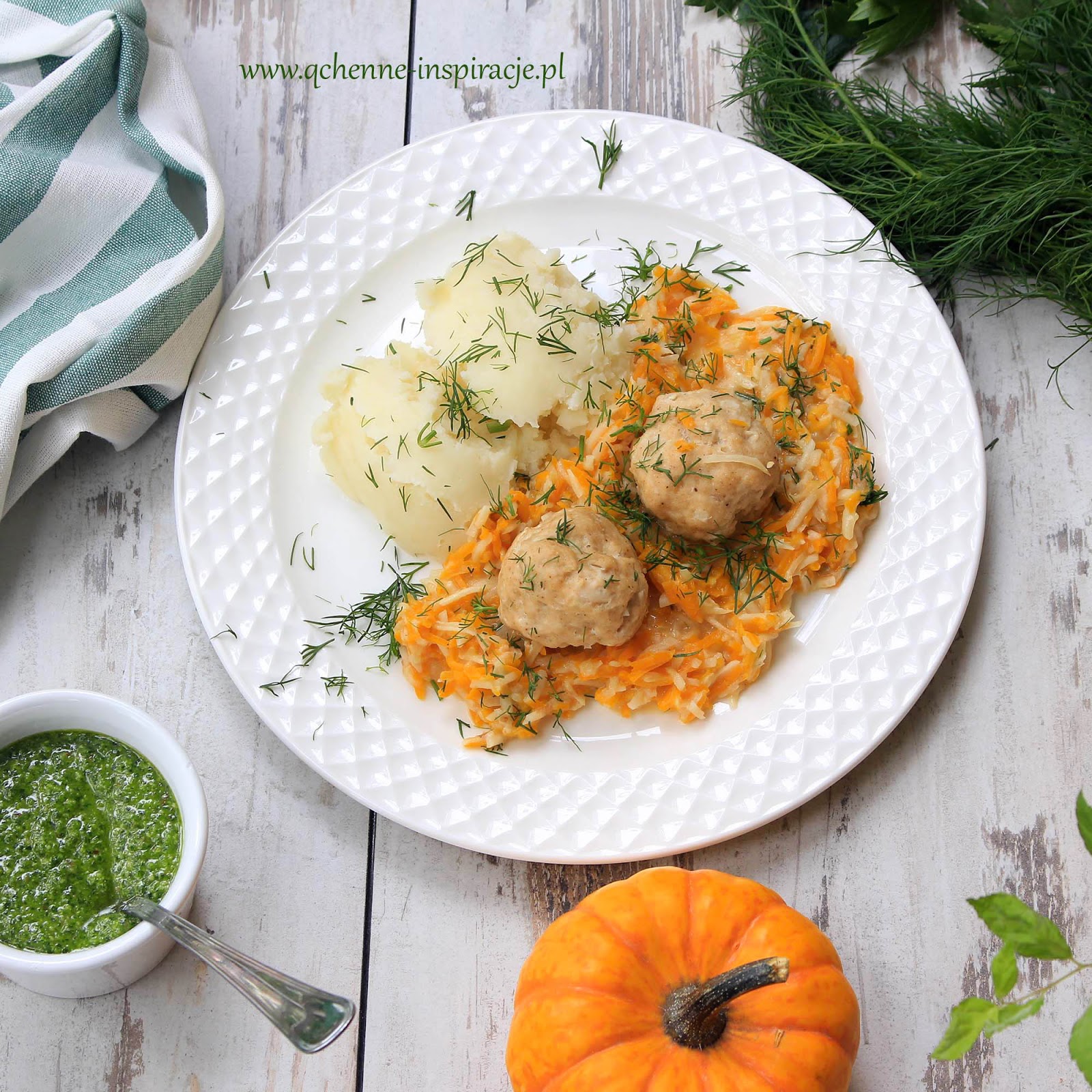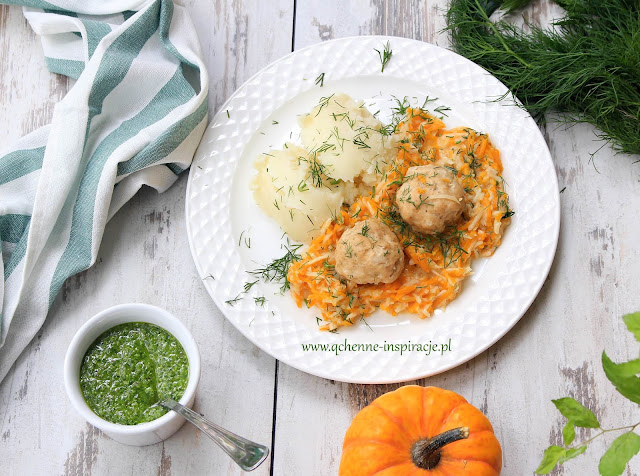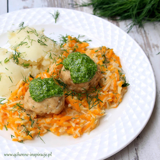 Delikatne pulpeciki z indyka. Będziecie zaskoczeni co tam dałam do środka. Do tego młode aromatyczne warzywka podrasowane szczyptą curry i petarda: pietruszkowe pesto z parmezanem, czosnkiem i migdałami. Daje kopa całej potrawie. Wychodzi sporo, przyda się do kanapek.