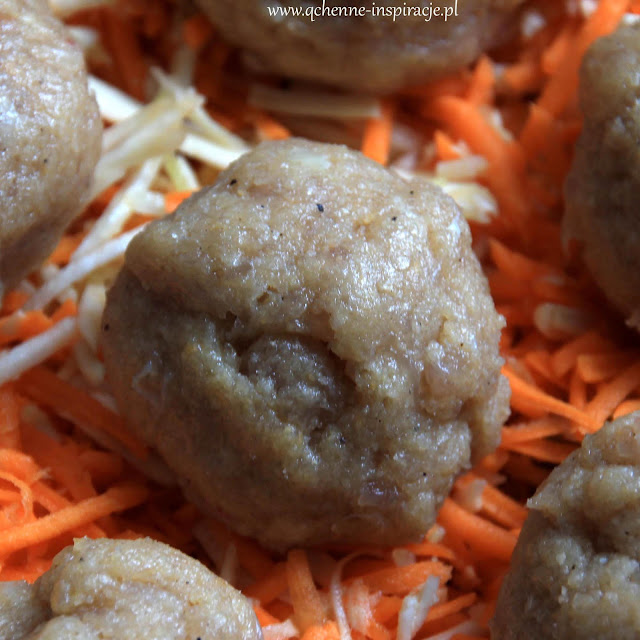 3. Ręce zwilżamy wodą. Formujemy pulpeciki. Układamy na warzywach. Podlewamy wodą. Zamykamy pokrywę naczynia do zapiekania i wstawiamy do piekarnika nagrzanego do 200 stopni na 20 minut.