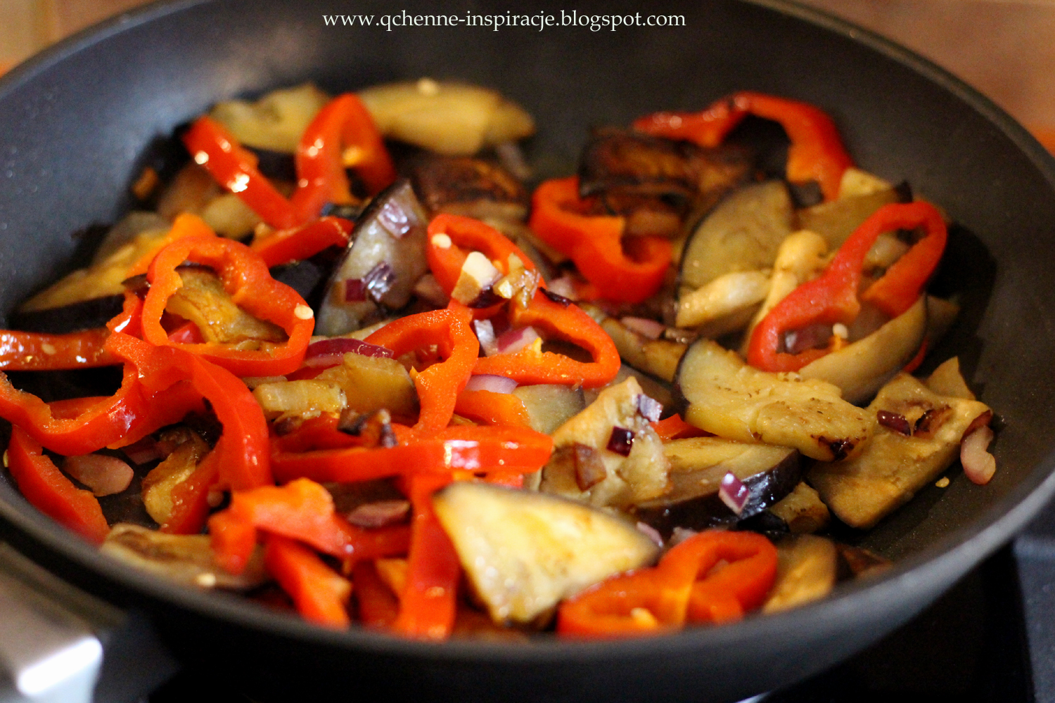 1. Warzywa kroimy w dowolnej wielkości paski lub kawałki. Na klarowanym maśle podsmażamy lekko posolonego bakłażana. Przykrywamy pokrywką, dusimy do miękkości. Do miękkiego bakłażana, dodajemy cebulę i paprykę. Ponownie przykrywamy pokrywką, dusimy do miękkości.