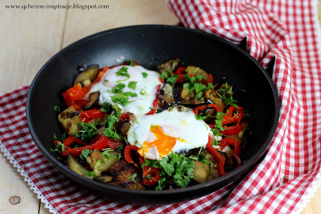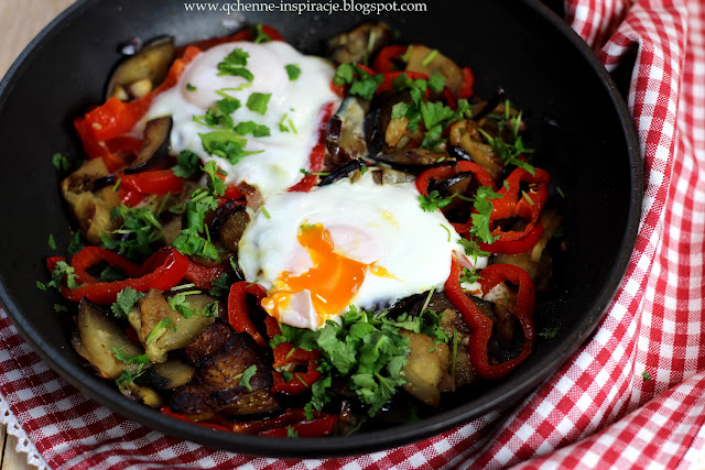 Słodycz lekko podsmażonych, duszonych warzyw doprawionych aromatyczną, świeżą kolendrą genialnie współgra z jajkiem z płynnym żółtkiem.