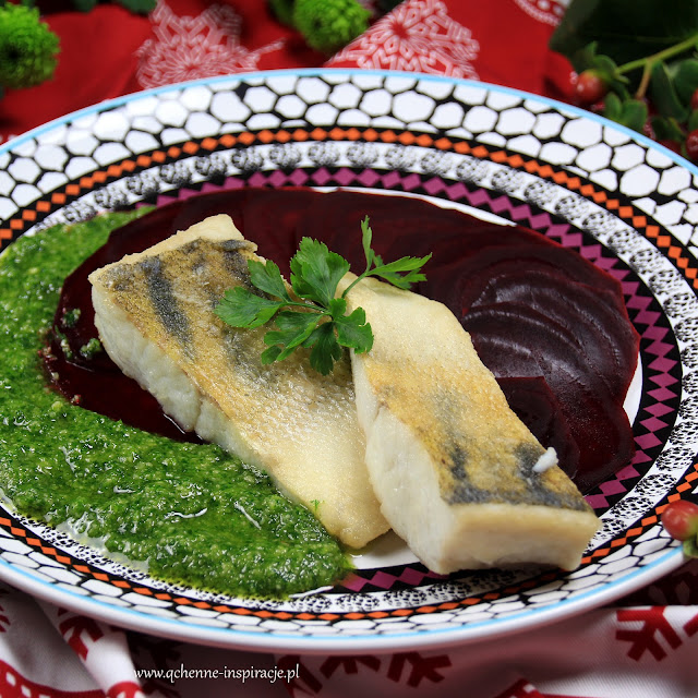 Ziołowe wyraziste pesto fajnie podkreśla smak delikatnego sandacza i w ogóle wszystkich delikatnych ryb. Polecam w zestawieniu z dorszem lub doradą. Całość fajnie przełamuje słodko - kwaśne carpaccio z buraka. Jeśli lubicie słodycz buraka saute, możecie pominąć skrapianie go octem balsamicznym. Polecam jednak skropić. W takiej wersji jest jeszcze lepszy ;).