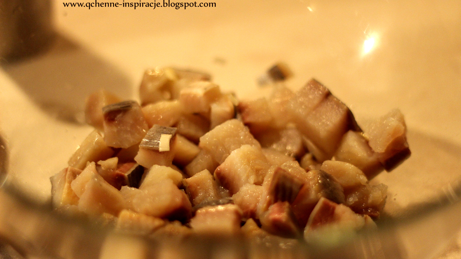 1. Śledzie zalewamy zimną wodą. Odstawiamy na 24 godziny. Płuczemy, kroimy w kostkę 1x1 cm.