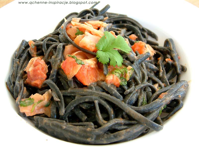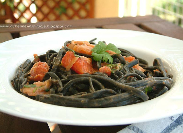 Marynowany różowy imbir i świeża kolendra nadają ostrości i wyrazistości którą tonuje mleko kokosowe i świeże pomidory. Czarny makaron jest egzotycznym dodatkiem, który oczywiście możecie zmienić na inny, ale polecam kupić jeśli będziecie w dużych delikatesach np. Alma, Piotr i Paweł czy innych tego typu. Ja staram się zawsze mieć tego typu produkty w domu ponieważ jeśli już na nic nie mam ochoty to na dania które miksują smaki zawsze się skuszę.