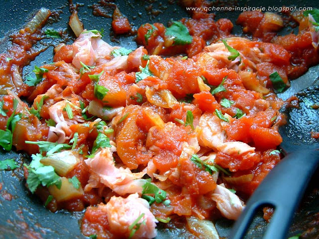 1. Pomidory sparzamy, usuwamy skórę, przekrawamy na cztery części, usuwamy gniazda nasienne.