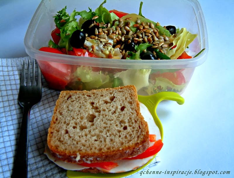 * 100 gramów fileta z indyka (marynujemy przez godzinę w oliwie, czosnku i ziołach prowansalskich - zamarynowanego fileta smażymy na suchej patelni i kroimy w plastry) - ok. 120 kcal