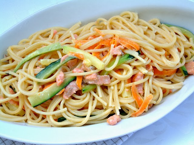 Obiad ok. 530 kcal*spaghetti z łososiem, cukinią i marchewką - ok. 530 kcal
