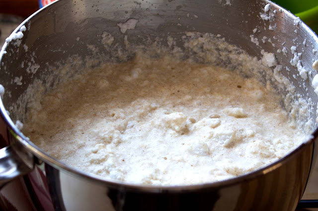 2. Mąkę miksujemy z mlekiem. Cały czas miksując dodajemy żółtko, sól i wanilię.