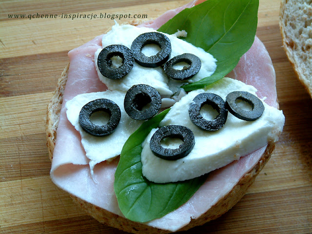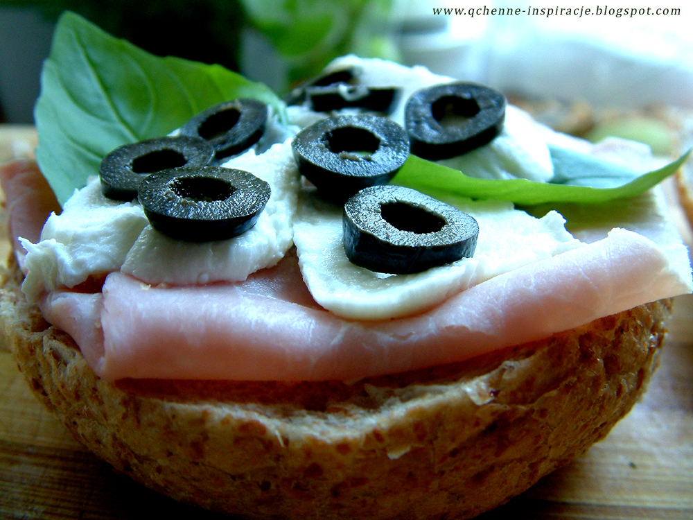 Wersja 2 - z szynką, mozzarella i oliwkami. Wersja idealna po treningu jeśli nie mamy możliwości zjedzenia innego posiłku niż "na sucho". Z takiej kanapki zadowoleni będą zwłaszcza panowie.