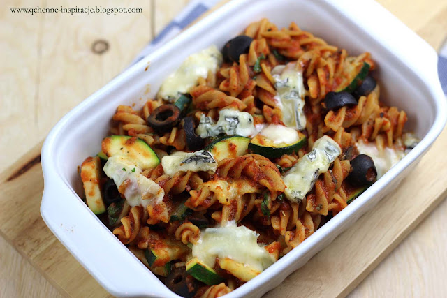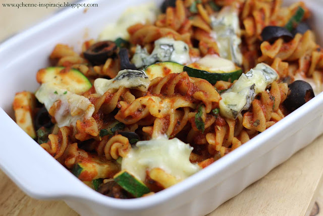 Wegetariańska zapiekanka z pomidorami, cukinią, oliwkami i serem pleśniowym. Jedna z moich ulubionych. Zazwyczaj robię ją w soboty, ponieważ to bardzo szybki obiad i na dodatek bardzo lubiany przez moje dzieci.