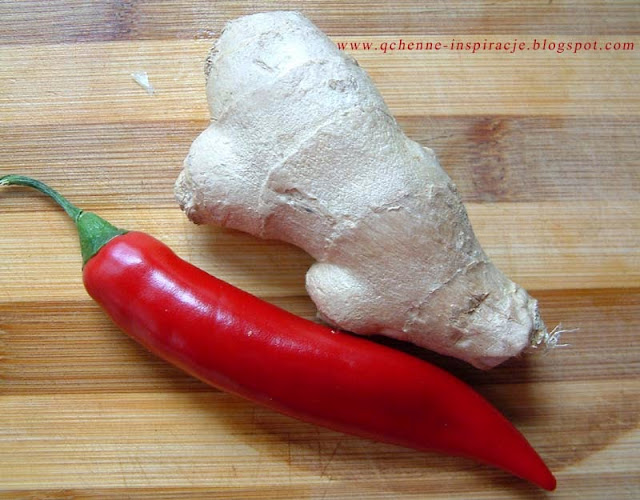 3. Do zupy dodajemy imbir i papryczkę chili. Osoby które nie lubią intensywnie ostrego smaku niech dodadzą tylko imbir a pominą papryczkę.