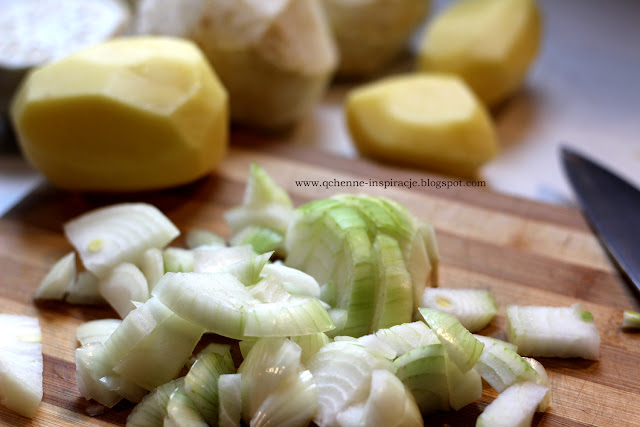 1. Cebulę kroimy w kostkę. Selera i ziemniaki obieramy ze skórki, także kroimy w kostkę.