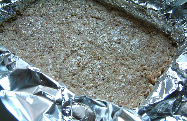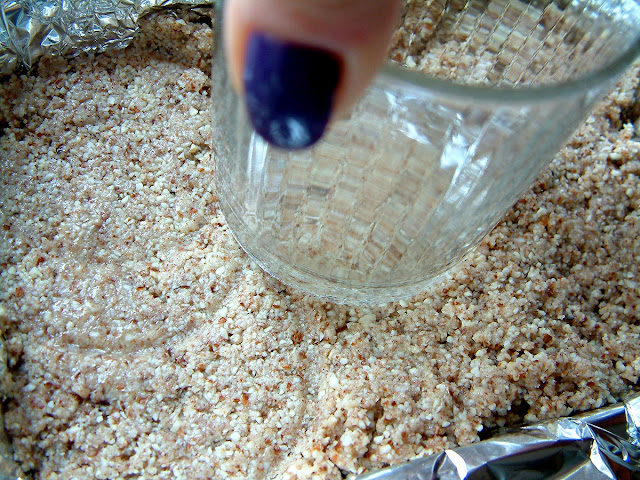 3. Masę przekładamy do wyłożonej folią aluminiową formy, dociskamy używając np. szklanki, zawijamy folię aby przykryć wierzch chałwy. Wstawiamy do lodówki an 4 godziny.