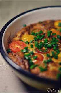 Cebulę zalać przygotowaną masą, ułożyć pomidorki i smażyć około 3 minuty.