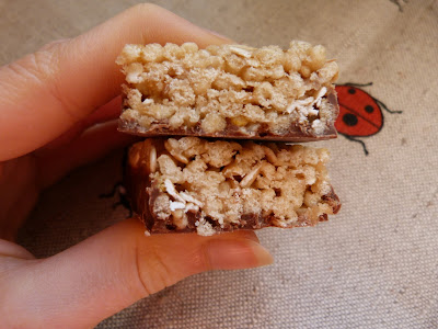 Batonik w środku lekko mnie zawiódł. Myślałam, że będzie obsypany czekoladowymi mini kosteczkami i kawałkami bananów. Tu jednak dostałam masę zlepków z płatków i kulek ryżowych...