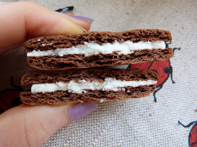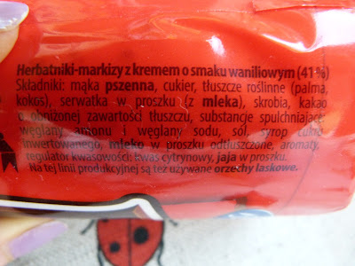 Smak: Gdyby ktoś mi nie powiedział, że są to hity waniliowe, to nigdy bym się po samym zapachu nie zorientowała z czym mam przyjemność obcować. Markizy pachną tak intensywnie kakao, że w ogóle nie czuć aromatu nadzienia. Ciastko jak ciastko, mocno kruche i intensywnie kakaowe, na prawdę niezłe i zjadliwe. I to na tyle pozytywów, bo nadzienie to istny koszmar! To ''coś'' jest jeszcze gorsze niż w kokosowych, a myślałam, że już tamtych nic nie pobije...Słodka, tłusta i oleista masa, która z waniliowym smakiem ma tyle wspólnego, co ja z matematyką (</3). Okropne, paskudne i niejadalne. Normalnie miała ochotę rozdzielić ciasteczka, wydłubać krem i jakoś ratować się samym herbatnikiem. Nie polecam, bo to chyba najgorsze z dostępnych Hitów!