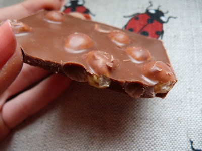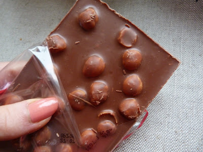 Czekolada jest smaczna, ale lekko margarynowa (?) i jak bym miała jeść ją solo, to nigdy bym jej nie wybrała. Kiedyś była to kwintesencja mlecznego smaku, a teraz firma poszła na ilość...z resztą jak każda kiedyś ''znacząca'' firma. Popsucie się smaku wyczułam nawet w RS czy Lindt więc nie ma co się dziwić. Wracają do czekolady...górnolotna nie jest, ale orzechy kompletnie zmieniają jej smak. Każdy pasek jest pełen orzechów i u mnie nie było opcji, aby jakiś został pusty. Orzechy są świeże, dobrze podprażone i cudownie chrrrupiące! Ich smak jest obłędny i mogłabym wyjeść je same, a czekoladę zostawić ;) Ogólnie jest to na prawdę dobra i porządna tabliczka, ale jej jakoś znacznie się obniżyła. Jeżeli miałabym kupować już czekoladę z orzechami to brałabym Milkę (która wypada chyba najlepiej) lub RS.