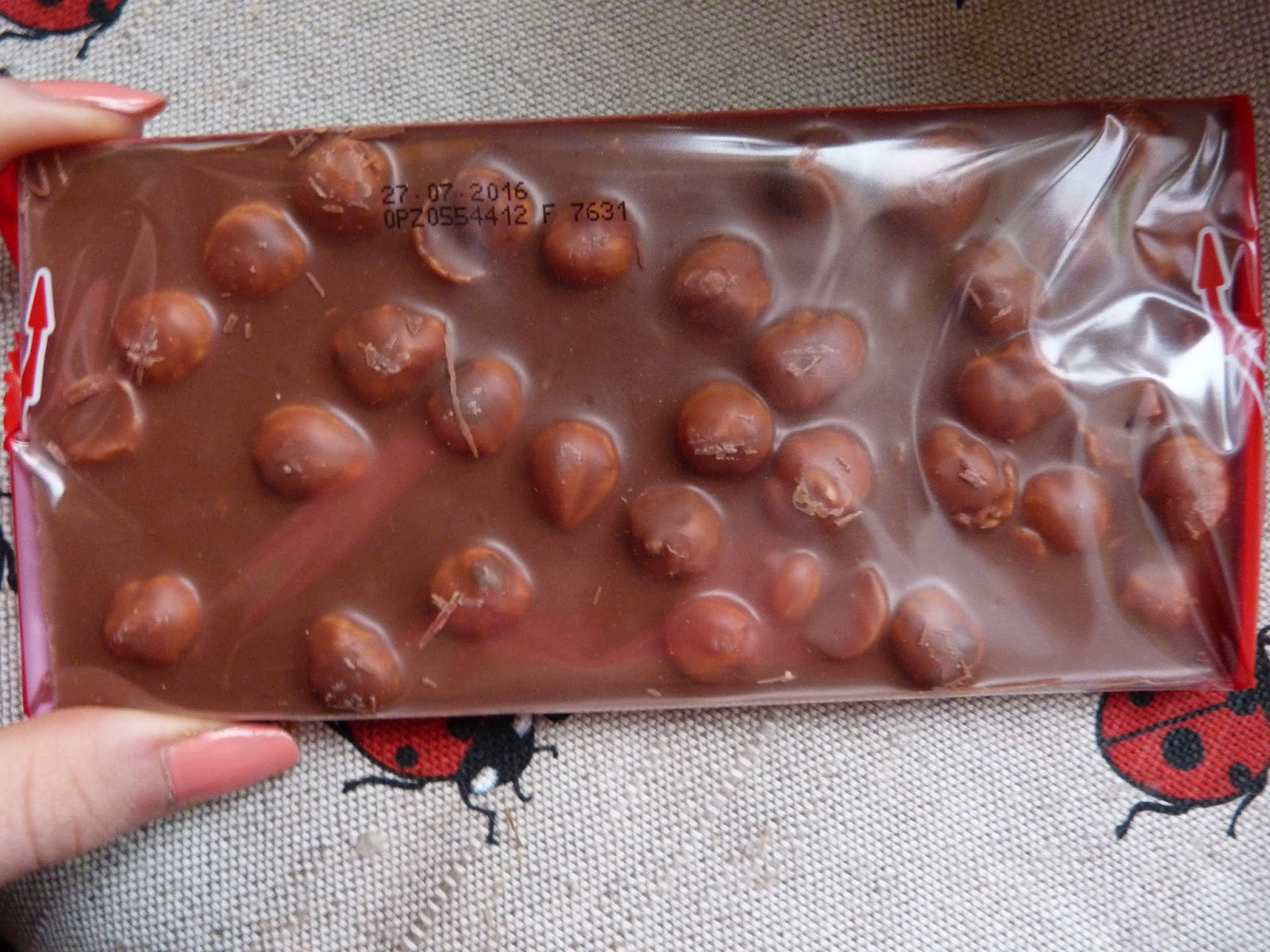 Wygląd: Niepozorny kartonik z okienkiem przez, które widać naszą hojnie obdarzoną w orzeszki czekoladę. Grafika na opakowaniu niby prosta, ale dosłowna i urokliwa. Zawsze jak na nią patrzę, to przypominają mi się czasu przedszkola :) Czasami w czekoladach ''z okienkiem'' bywa tak, że orzechy/dodatki są tylko w miejscu wycięcia, a cała czekolada pozostaje pusta...tutaj nie ma mowy o takim oszustwie! Czekolada jest dosłownie zalana orzechami i aż prosi się aby ją zjeść.