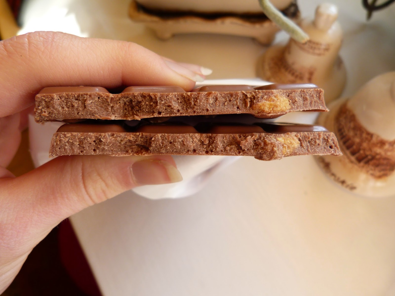 Smak: Czekolada mleczna, mocno słodka, bardzo, ale nie aż tak jak w czekoladach Nestle. Jest to czekolada mocno mleczna, dobrej jakości, która przyjemnie rozpuszcza się w buzi. Tradycyjna Milka, ot co ;) Ale jak wypada jej połączenie z soloną kukurydzą? Dla mnie bomba! Może ciut mało soli, ale i tak bardzo mi smakowała. Kukurydzy jest nawet sporo, w każdym bądź razie idealnie. Fajnie chrupie pod zębami. Najpierw czujemy słodycz, a następnie wtrąca się sól. Na prawdę fajne połączenie. Kukurydza jest dobrze wypieczona, nie miękka czy twarda jak kamień. Jedynym minusem dla mnie jest u niej za mała ilość soli i za słodka czekolada.