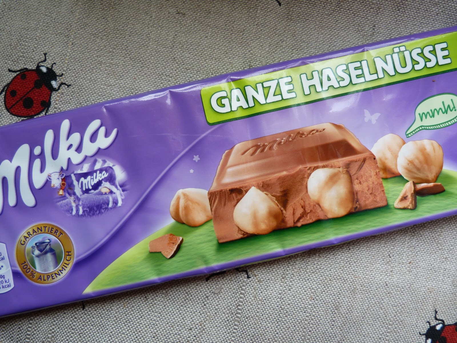 Wygląd: Duża, solidna i gruba tabliczka z ''krowim'' motywem i fioletową barwą. Tabliczki Milki są chyba najbardziej rozpoznawalnymi czekoladami w Europie ;) Fiolet i zieleń to nie jest zbyt dobre połączenie kolorystyczne, ale co ja się będę czepiać. Zieleń to kolor głównie kojarzony z orzechami w czekoladach i słodyczach więc koniec marudzenia :D