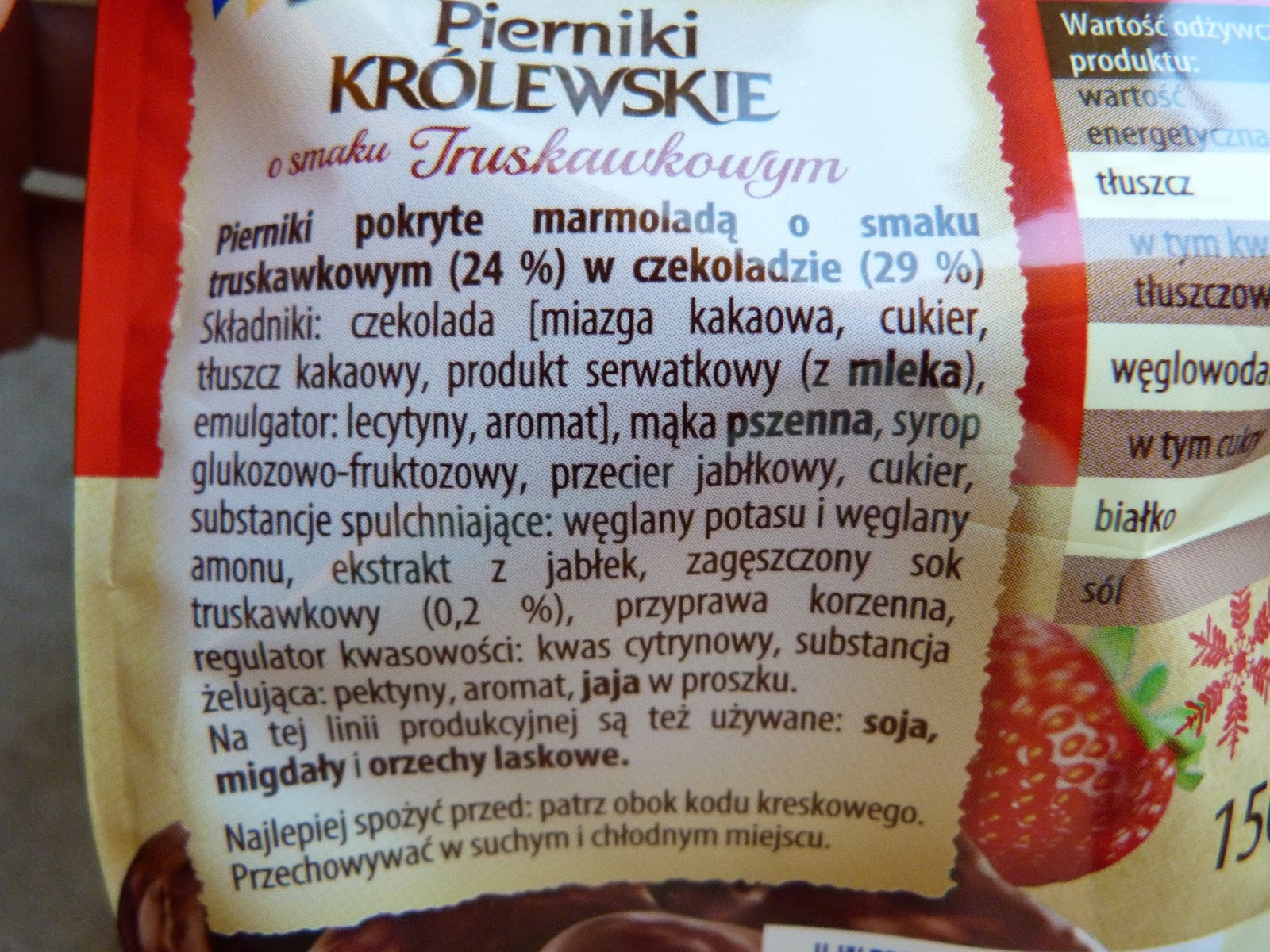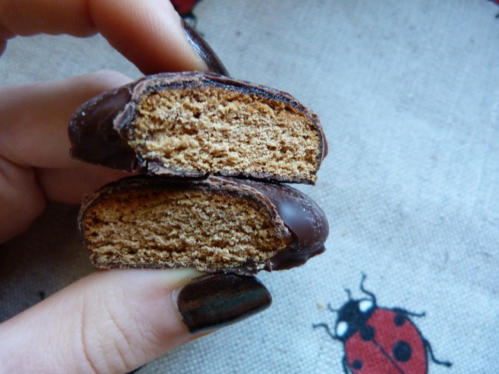 Polewa jest bardzo smaczna, intensywnie kakaowa. Pierniczek, jak pierniczek. Smaczny, korzenny i nie za słodki. Truskawek w środku to ja tu nie czułam, a jedynie okropną słodycz taniej marmolady, której nieźle poskąpiono. Byłam święcie przekonana, że znajdę jej sporą ilość wewnątrz pierniczka, a nie...tylko minimalnie ''liźniętą'' u góry ciastka...
