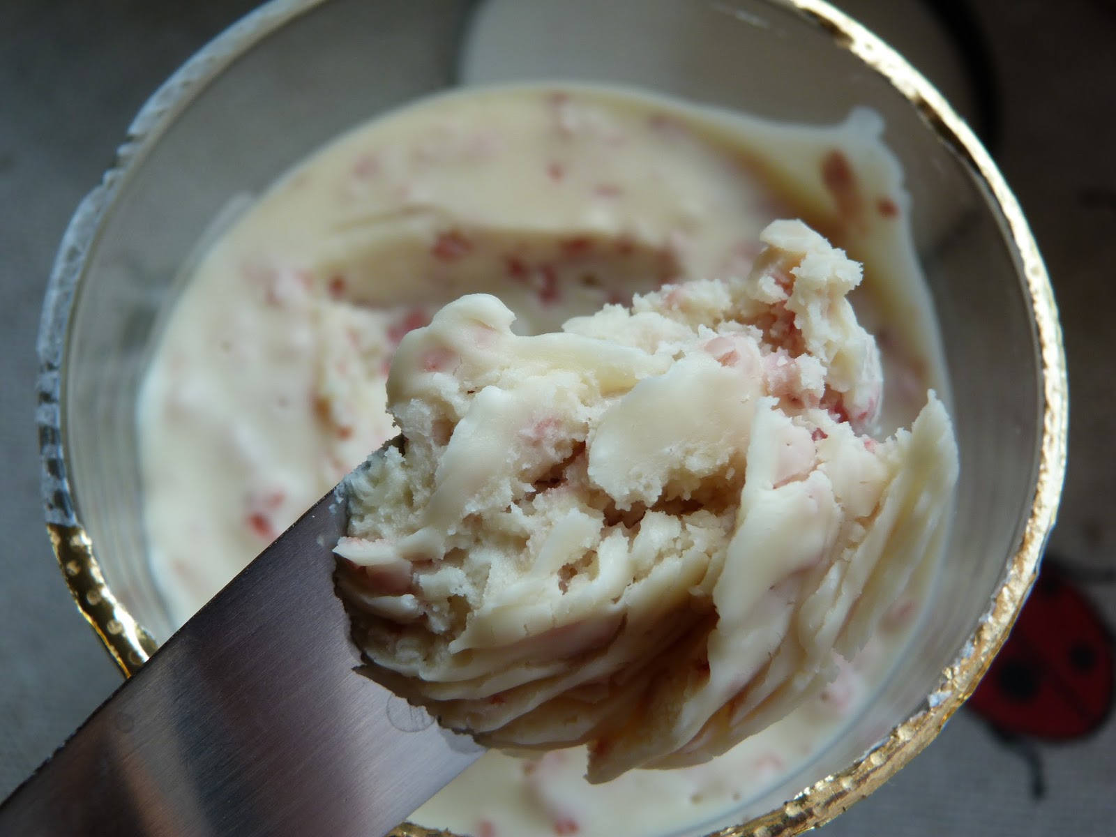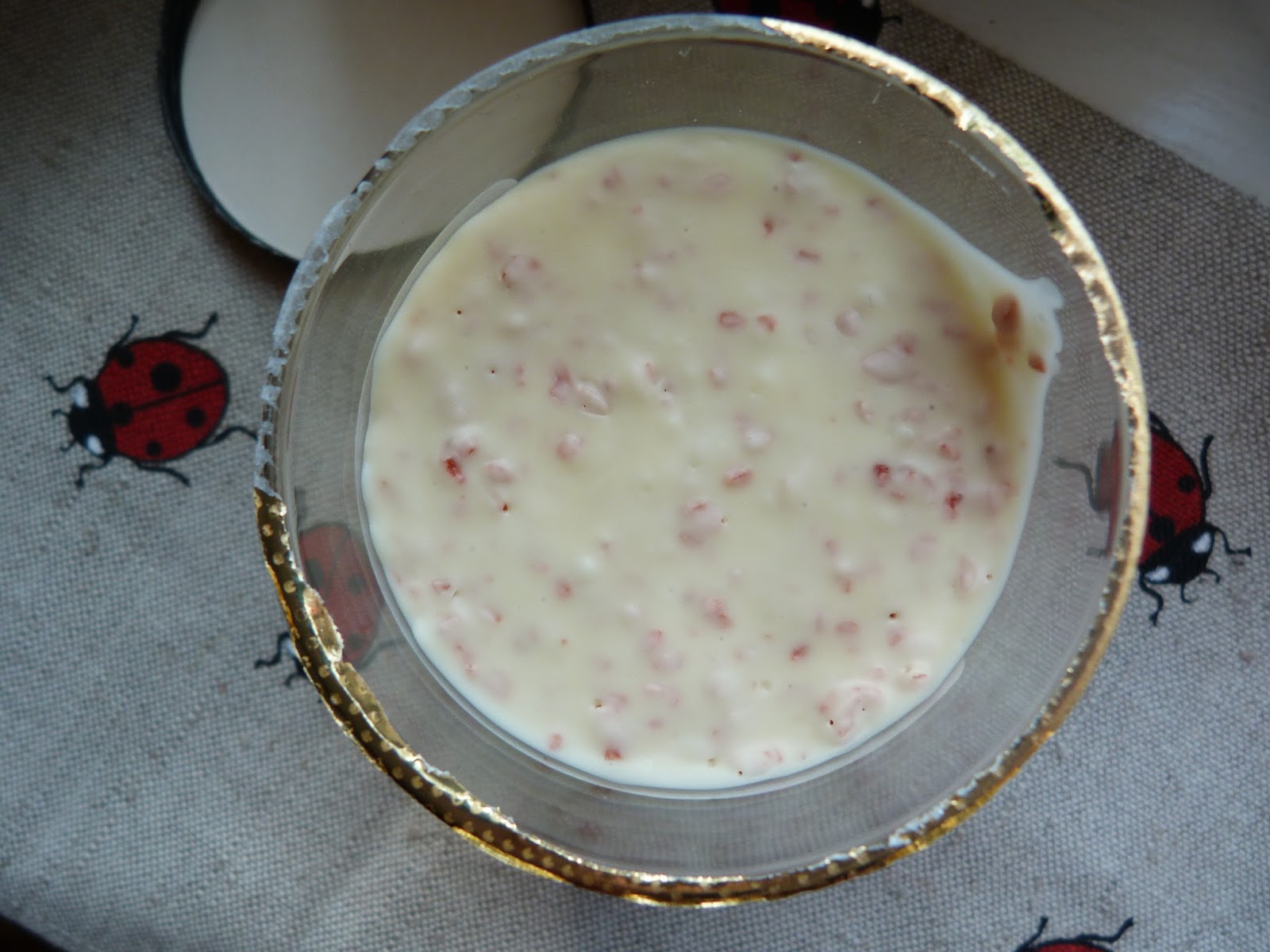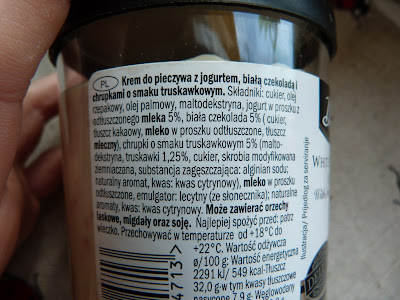 Smak: Już po zerwaniu wieczka wiedziałam, że krem będzie dla mnie za słodki. Woń kwaśno-słodka aż drażniła i niezbyt zachęcała do spróbowania. Jednak krem nie czekał zbyt długo, bo moja chcica na słodkie była większa ;) Kremowa konsystencja bardzo mi odpowiadała, bo była identyczna, jak w kokosowym wariancie. Chrupek liofilizowanych truskawek było na prawdę dużo i nie było opcji, abym nie nabrała ich na nóż. Kremowy, lekko tłusty...ale jak smak? Powiem Wam, że jest zdecydowanie zbyt mocno aromatyzowany. Myślę, że bez tego wyszłoby dużo lepiej, a krem zyskałby mniej słodki smak. Kwasek truskawek jest typowy dla liofilizowanych owoców, ale słodycz i mdłość jogurtowa przytłacza ogół. Ten jogurtowy posmak jest tu zbędny, bo on wszystko zamula i psuje efekt. Nie wiem po co on został tu zastosowany, ale sama ''biała czekolada'' starczyłaby w tym zestawieniu. Chrupki truskawkowe przynajmniej fajnie chrupią i po rozgryzieniu niwelują słodycz, ale tylko na chwilę i po tym pojawia się tłusta mdłość.