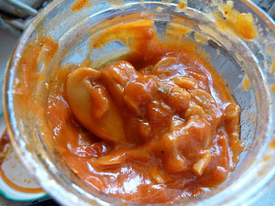 Wygląd i smak: Niepozorny słoiczek z niepozornie wyglądającą zawartością. Wiem, że są dwie wersje - ta i pikantna, ale jakoś szczególnie nie różnią się więc trzeba uważać co łapki biorą.