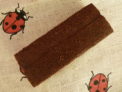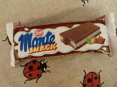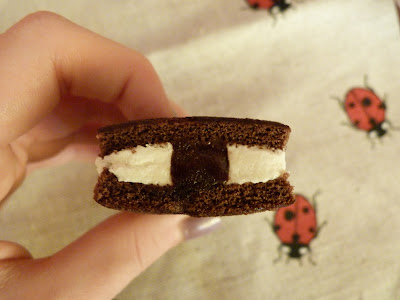 Kanapka jest ciemniejsza niż jej kolega ''Kinder'', ale mam wrażenie, że jest bardziej intensywna w zapachu. Czuć tu wyraźnie wilgotne ciasto, coś jak a'la brownie - pycha ;) Wygląda w sumie podobnie, gdyby nie ten krem w środku. Właśnie...krem jest biały, a przez sam środeczek przechodzi krem czekoladowo-orzechowy.