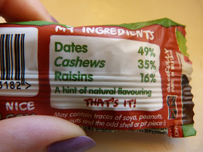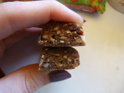 Smak: Pozwólcie, że zacznę od zapachu, który jest wprost zniewalający! Idealnie odwzorowuje zapach piernika, upieczonego specjalnie na Wigilię ;) Mocny korzenny aromat połączony ze słodyczą daktyli - bomba! Batonik jest bardzo plastyczny, gliniasty i lepki. Łatwo można go pokroić, a następnie formować w kuleczki. Jak widać na zdjęciach, jest przepełniony drobno posiekanymi orzechami nerkowca. Nerkowce są świeże, chrupiące i wyraźne w smaku. Całość idealnie ze sobą współgra, rodzynek nie czuć (dla mnie to ważne :D) i batonik jest P-Y-S-Z-N-Y! Szkoda, że nie ma Polskiego odpowiednika ;)