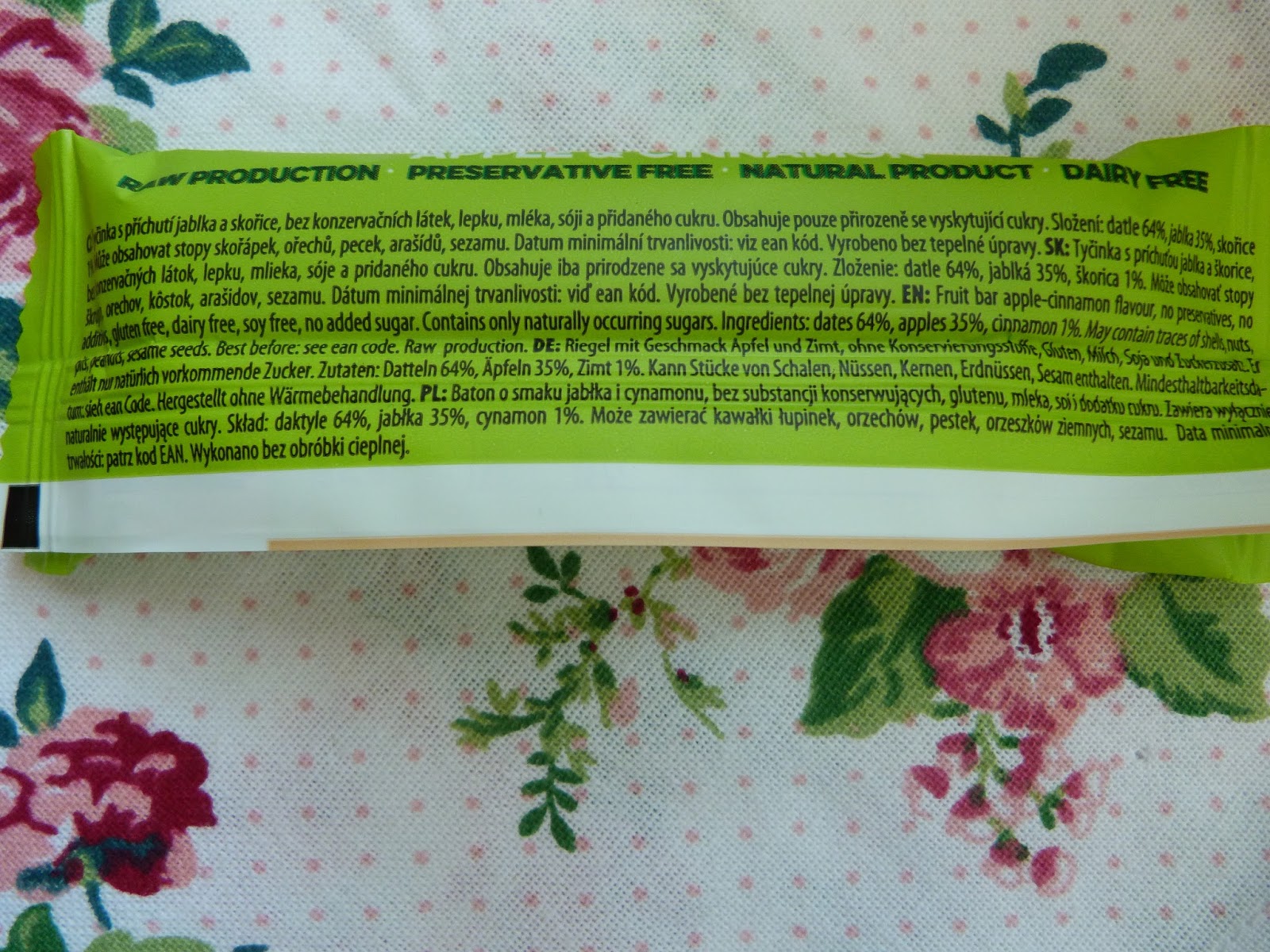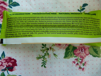 Wygląd i smak: Już na samym początku byłam bardzo pozytywnie nastawiona do tego batonika. Zieleń jego opakowania tak pozytywnie raziła w oczy, że człowiek odruchowo chce go zjeść :D Dodatkowo zachęca bezbłędny skład, który składa się tylko z daktyli, jabłka i cynamonu - dacie wiarę!? ;) Po szybkim rozpakowaniu moim oczom ukazała się bardzo ciemna, podłużna bryłka, która przepięknie pachniała cynamonem. Aromat był tak boski, że od razu ślinianki zaczęły intensywnie pracować. Kocham połączenie jabłka z cynamonem i uważam je za totalny fenomen! Jak sprawdziło się tutaj?