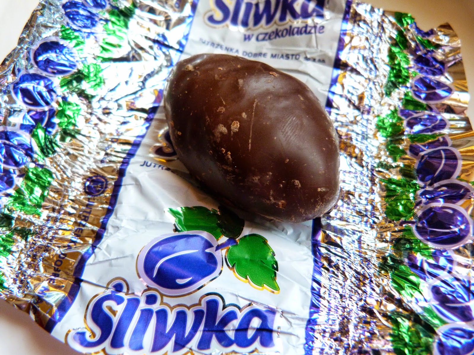 Wygląd: Piękny papierek, srebrno-fioletowy, który mocno rzuca się w oczy. Zdobi go masa fioletowych śliwek. Co prawda śliwek ja nie kupiłam, ale moja mama, która je uwielbia :) Śliwki są dużo mniejsze, bardziej lekkie i mniej okrągłe.