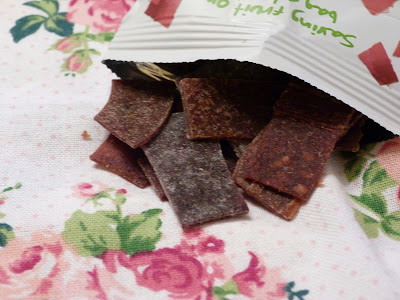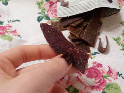 Wygląd i smak: Jak suszona wołowina wygląda to chyba każdy wie. Ta tutaj, kompletnie wegańska i pozbawiona bólu innych stworzeń, owocowina, bardzo ją przypomina! Po otwarciu paczuszki, która swoją drogą jest prześliczna i bardzo przyciągająca, doznałam pozytywnego szoku - to na prawdę wygląda jak amerykański przysmak! Jednak zapach mówił coś innego i zapowiadał owocową ucztę ;) W tej wersji smakowej pierwsze co wyczułam to kwasek jabłka ze słodyczą bananów. Troszkę przypominał mi on takie musy dla dzieci, które swoją drogą uwielbiam i często kupuję :D W konsystencji bardzo ciekawe, twarde, ale plastyczne. Pachnie dosyć mocno, można wyczuć wszystkie nuty, ale swoją ''owocową moc'' uwalnia dopiero po skosztowaniu. Smak? Pyszny! Bardzo orzeźwiający, lekko kwaśny i lekko słodki. Czuć tu prawdziwe owoce, a nie jakieś aromaty z cukrami czy słodzikami. Jak to na suszone puree przystało, owocowina momentalnie rozpuszcza się w buzi i pozostawia na języku bardzo przyjemny posmak. Niby niepozorna paczuszka, a potrafi zaspokoić pierwszy głód i chrapkę na coś słodkiego :) Jestem na tak!