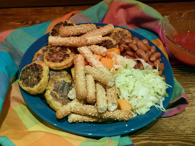 Podajemy z ulubionymi dodatkami, a u mnie to odrobina fasolki, marchew, surówka, pyszne paluchy z sezamem i sos pomidorowy.