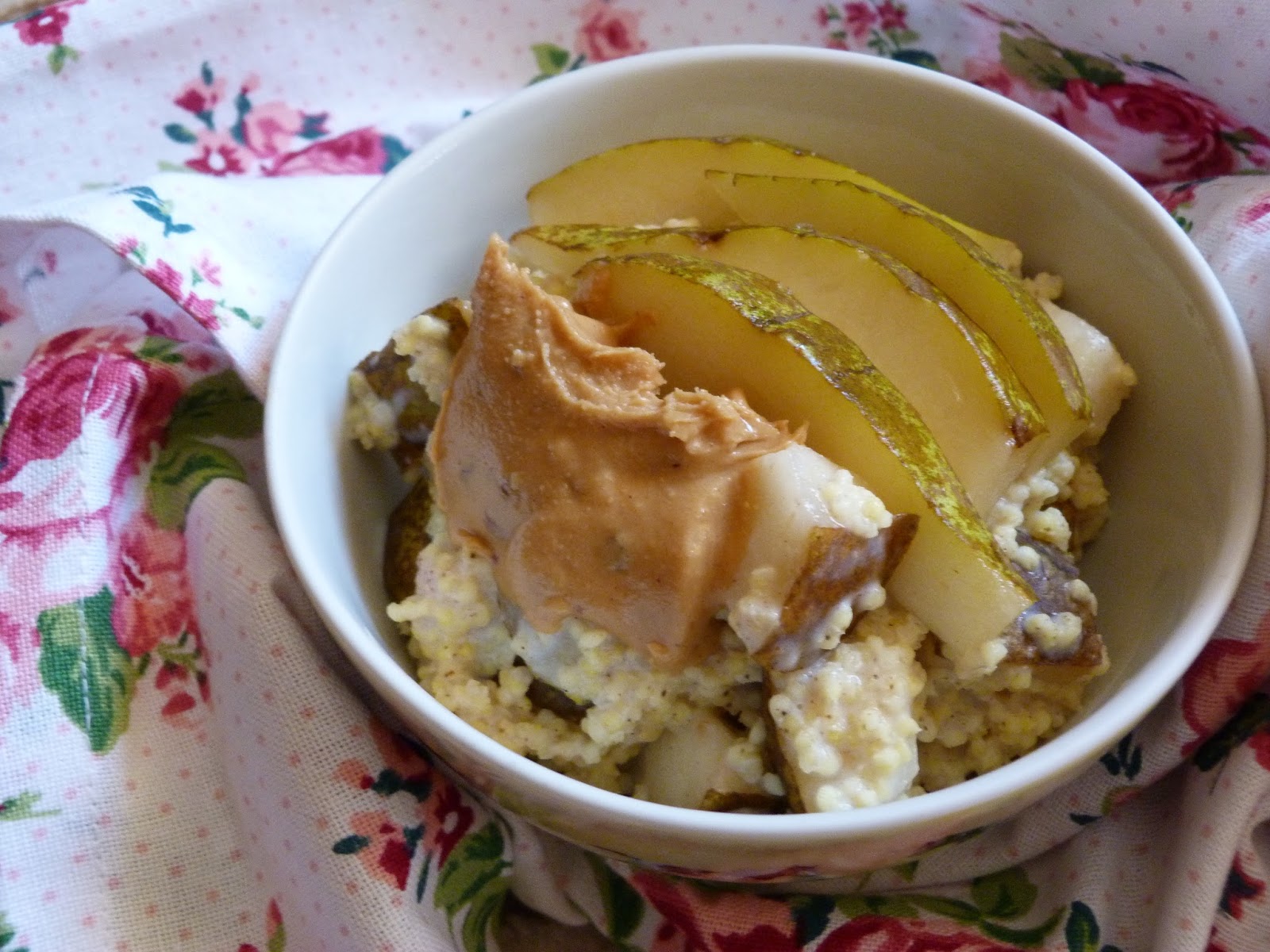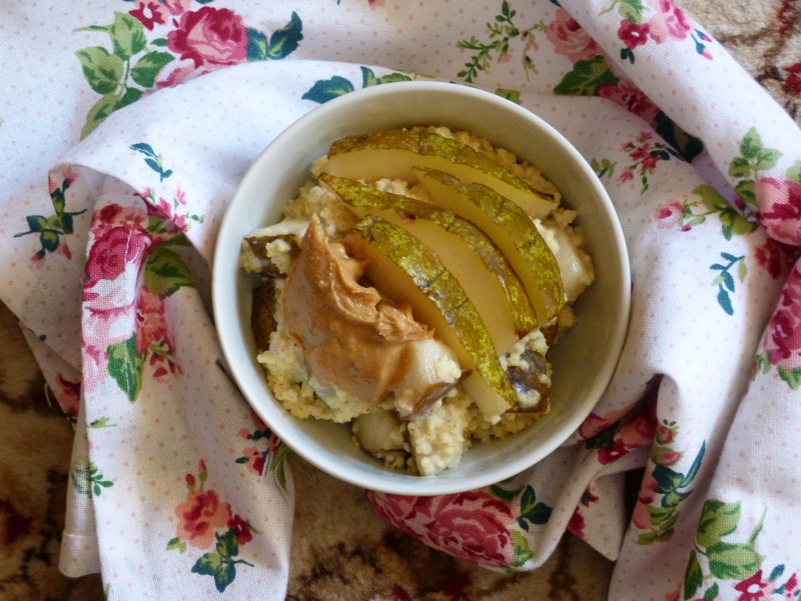 Migdały siekamy na bardzo drobne kawałki i dosypujemy do naszej kaszy. Gruszkę myjemy, kroimy w kosteczkę i również dodajemy do kaszy. Gdy jaglanka będzie już gęsta i klejąca, dosypujemy do niej cynamon i jeszcze chwilę trzymamy na ogniu. Gdy jaglanka będzie już gotowa, przelewamy ją do miseczki i dekorujemy masłem orzechowym - smacznego! :)