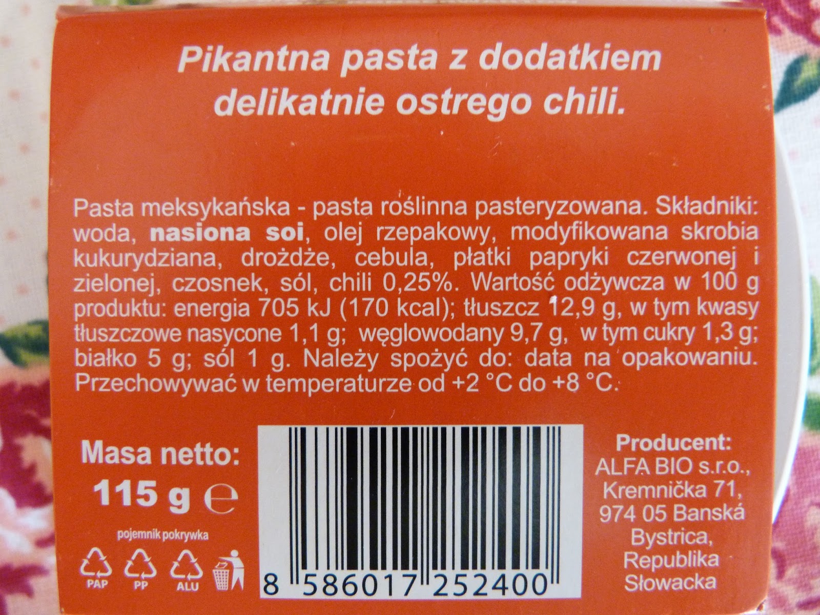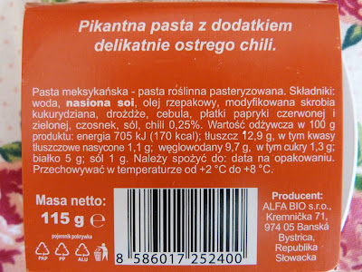 Pasta w środku jest czerwona i ma w sobie drobinki papryki czerwonej i zielonej. Jej zapach na samym początku mówił jedno - będzie pikantnie! Czy tak też się okazało? Powiem Wam, że na początku jej kosztowania wydała mi się totalnie mdła i bez wyrazu. Nie czułam żadnej ostrości, a jedynie skórki od papryczek. Jednak po czasie, kiedy pastę już zjadłam na końcu języka zaczęło mnie palić. Było to przyjemne, nie nachalne, ale nasilające się z minuty na minutę. Dla osób o wrażliwych kubkach smakowych będzie raczej za ostre, ale myślę, że to fajna alternatywa dla wszystkich past z tofu, które są raczej bardzo delikatne. Ogólnie fajna rzecz, ale nie tak wybitna jak pozostałe smaki :) Czy polecam? Tak, bo możliwe, że sama do niej wrócę.