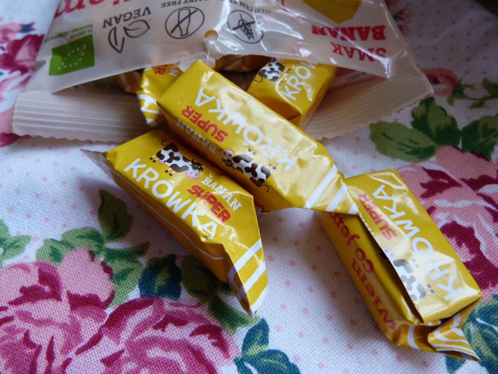 Wygląd i smak: Zacznę oczywiście od samego opakowania, które jest prześliczne, urocze i przyciągające uwagę. Pisałam już to wcześniej, ale cóż...opakowanie się nie zmieniło, a jedynie kolorek, który jak na banana przystało jest żółty :) Podchodziłam do nich trochę z rezerwą, bo wiem z doświadczenia, że słodycze o bananowym aromacie bywają sztuczne i niezjadliwe, ale w tym przypadku się nie zawiodłam :) W środku krówki ani trochę się stopiły i dało się je spokojnie odrywać od papierka. Zaznaczę już na samym początku, że są to krówki CIĄGUTKI, a więc dla osób, które są wierne tym kruchym - nie polecam ;) Zapach był bardzo delikatny, praktycznie nie czułam banana, ale to nawet dobrze, bo oznaczało to naturalny jego wkład, a nie sztuczne badziewie. Miały bardzo słodki aromat, zdecydowanie słodszy niż poprzedniczki. Nie mogłam się długo powstrzymywać, a więc szybko zabrałam się za test smaku! Wrażenia? Ponownie miłość od pierwszego gryza, a co! :) Krówki okazały się IDEALNE w smaku i takie, jakie uwielbiam najbardziej. Słodziutkie, ciągnące i zaklejające :) Banana było wyraźnie czuć ale nie sztucznie, a właśnie bardzo subtelnie. Nadawał fajnej słodyczy i ciekawie komponował się z smakiem toffi. Toffi też wyraźnie czułam, ale nutka banana była! Są to chyba najsłodsze jakie jadłam, ale i tak OBŁĘDNE! Polecam, bo to unikatowy smak, który warto sprawdzić na własnych upodobaniach smakowych ;)