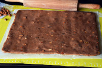 Pieczenie: Rodzynki i migdały siekamy, ale nie za drobno. Surowe ciasto dzielimy na trzy równe części. (Można się przy tym wspomóc wagą, ponieważ to naprawdę istotne, by blaty piernikowe były równe.) Do każdej z nich dodajemy po 1/3 bakalii i szybko zagniatamy. Przygotowujemy stolnicę lub blat, na którym będziemy wałkować ciasto. Najlepiej wychodzi to na silikonowej stolnicy, nie trzeba wtedy podsypywać mąką. Pierwszą część rozpłaszczamy dłońmi na prostokąt i przykrywamy arkuszem papieru do pieczenia (dzięki temu masa nie będzie kleiła się do wałka), a następnie wałkujemy, aż osiągnie wymiary 30x35 cm. (Wasze blaty piernikowe nie muszą mieć dokładnie takich samych wymiarów jak moje. Ważne, żeby wszystkie trzy były takie same.)